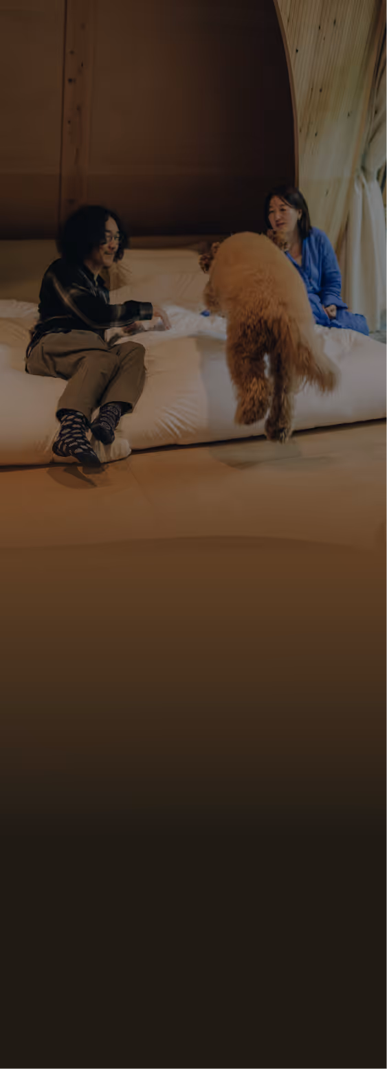 木の香りが広がるキャビン内。大きな窓から差し込む光の中で、愛犬と一緒にくつろげます。「自分の別荘に帰ってきたような安心感」と柳さん。